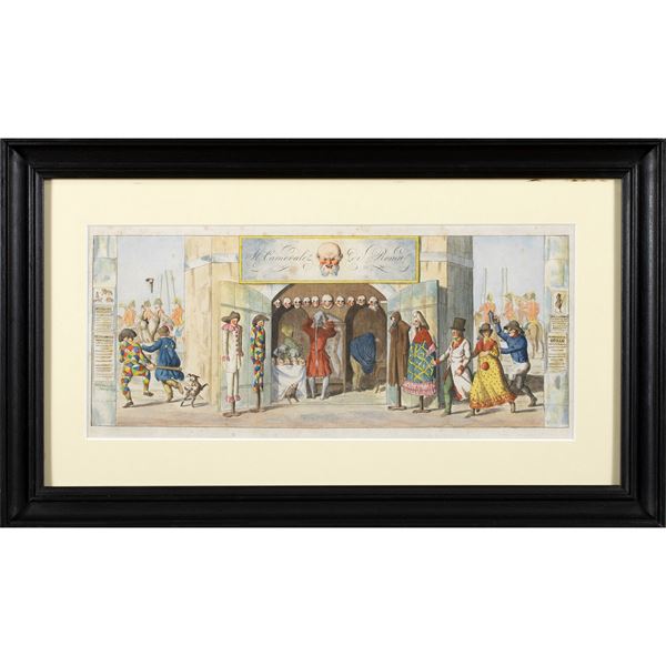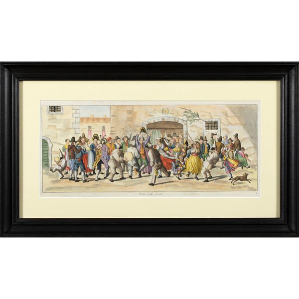 21x46 cm."Il Carnevale di Roma - Ballo nella Strada", 1820, pair of watercolor etchings, within frames
