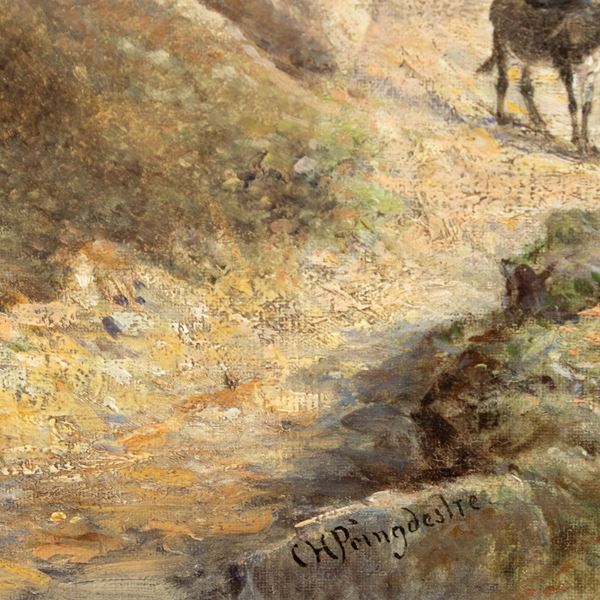 70.5x44 cm."View of Anticoli Corrado with characters", oil on canvas, signed lower center, framed