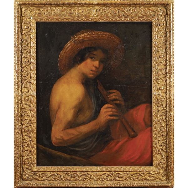 85,5x69 cm"Young flutist with straw hat", oil on canvas, framed