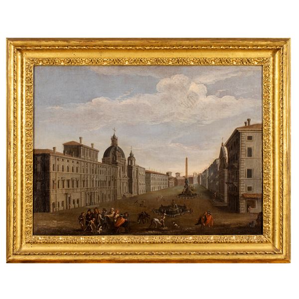 48x65 cm."View of Piazza Navona with figures", oil on canvas, framed