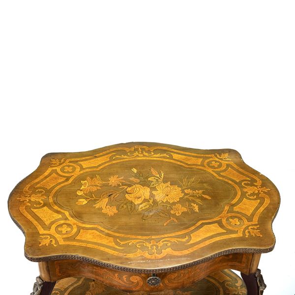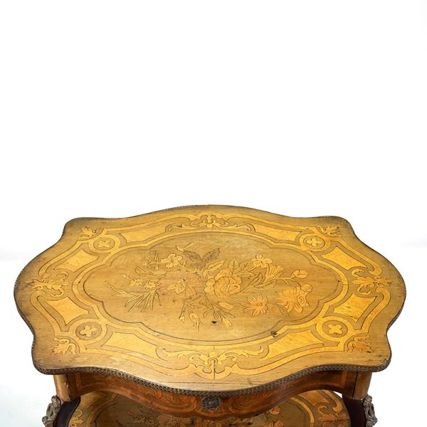 77x55x41 cm.shaped bodies inlaid with floral and vegetal motifs, structure with three shelves supported by shaped supports, wear and slight defects