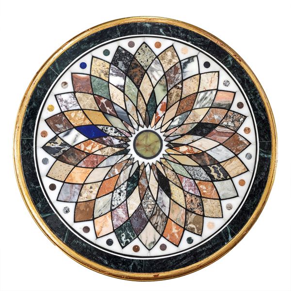 77x56 cm.circular tops made with samples of polychrome marble, resting on tripod bases in carved and gilded wood, slight defects