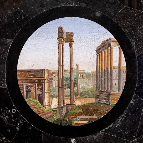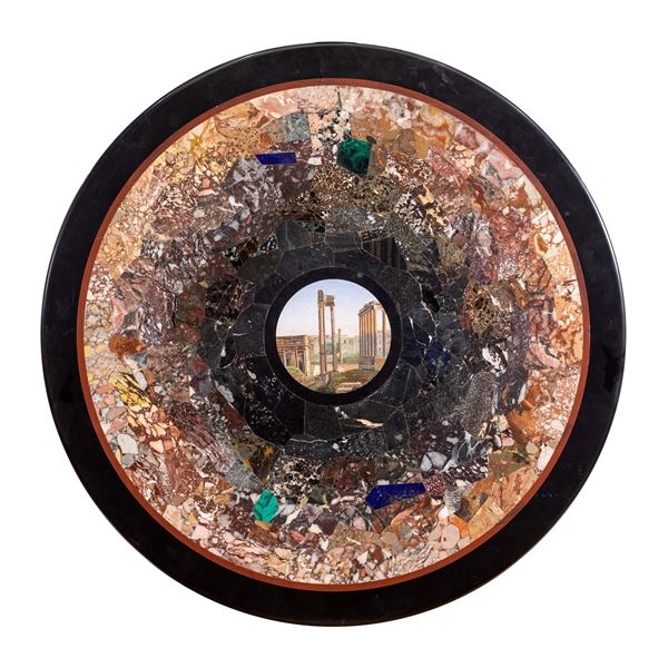 d. 71 cm. (top) - 73x71 cm. (structure)depicting the "Roman Forum", resting on a lacquered and partially gilded wooden table with shaped legs, a tripod base