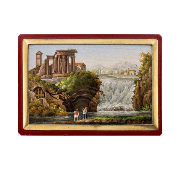 2.5x8.6x6.1cm.rectangular shape with micromosaic depicting "Il Tempio della Sibilla a Tivoli e cascate",, marks of Camillo Picconi 1820, active in Rome in via del Corso 90 from 1792 to 1826, S. Bulgari collection, defects