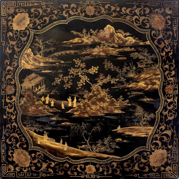 78x75x75 cm.with an oriental landscape and plant motifs, rectangular top resting on square supports, defects