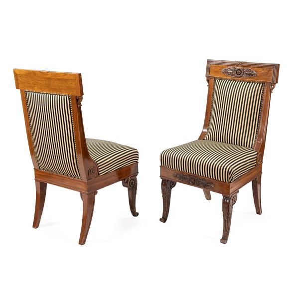sofa 98x204x62 cm. - chair 93x48x47 cm.comprising a sofa and four chairs, structure carved with vegetal and scroll motifs, shaped armrests, padded seats and backrests covered in fabric