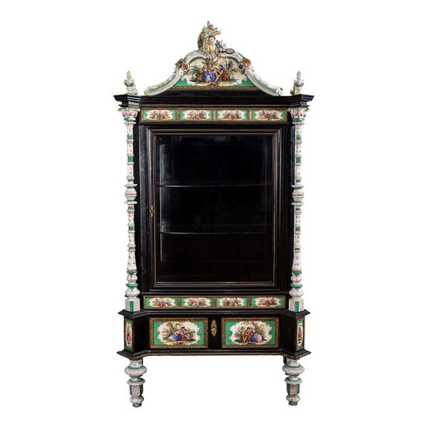203x103x56 cm.structure in ebonized wood and glass, decorated with polychrome porcelain plaques and columns, painted to depict gallant scenes and floral and vegetal motifs