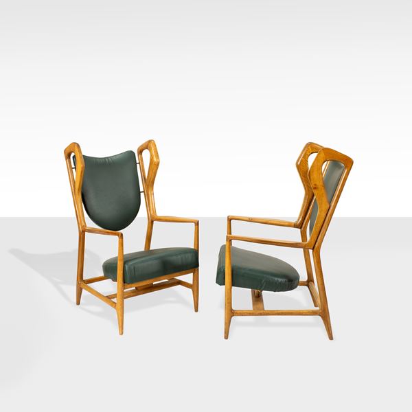 106x62x65 cm.pair of Triennale mod. armchairs in wood, brass and padded fabric, slight wears Literature: Domus n. 280, marzo 1953. Authenticity certificate by Gio Ponti Archives, Milan.