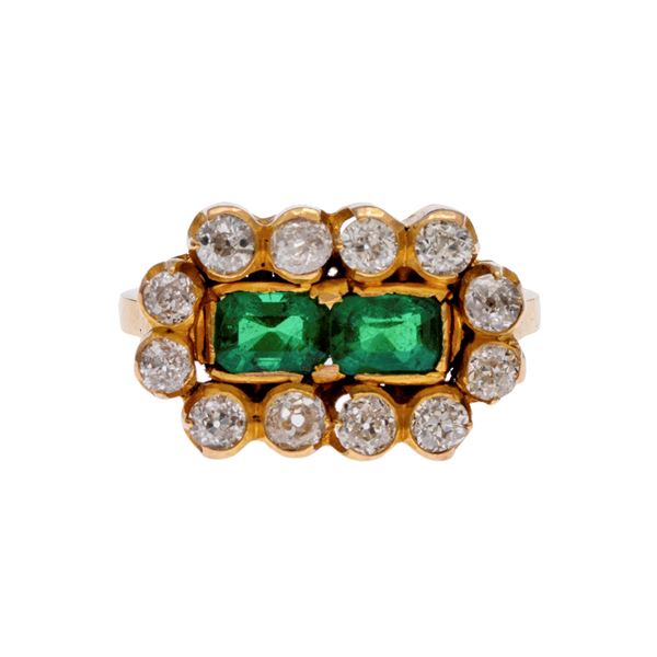 two emerald cut emeralds circa 0.90 ct, antique brilliant cut diamonds circa 0.90 ct, size 19
