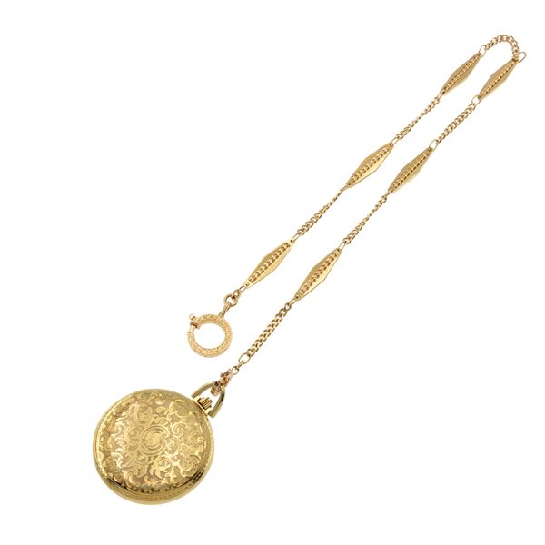 weight 57 gr.41 mm round case. champagne dial with indexes, mechanical movement with manual winding, peseux caliber 7046, complete with 18kt yellow gold watch chain, length 38 cm. signed case, dial and movement