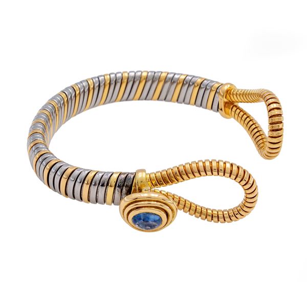 weight 37 gr.in 18kt yellow gold and steel centered by an oval cabochon cut sapphire, length 19