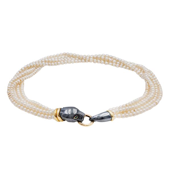 weight 56 gr.five strands of 4 mm cultured pearls. circa joined by a panther clasp in 18kt yellow and black gold, length 38 cm.