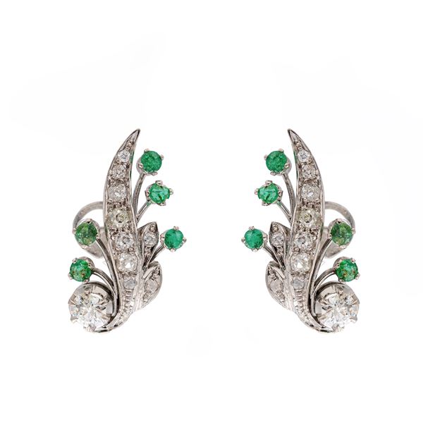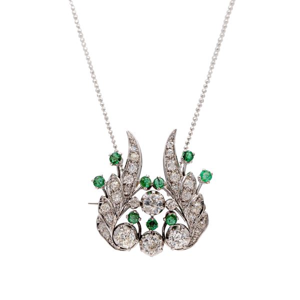 in 18kt white gold, circaa 4 ct old cut diamonds and round emeralds, lobe earrings length 2.7 cm. - pendant dimensions 3.1x2.8 cm. complete with 18kt white gold necklace, length 40 cm.
