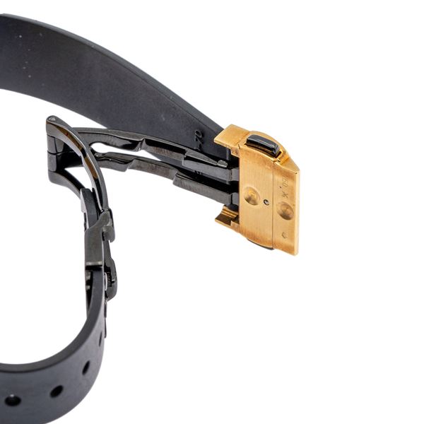 weight 60 gr.in 18kt yellow gold, ref. 1403.3/668528, 32 mm round case. black dial without indexes, date display at 3 o'clock, quartz glass, quartz movement, original rubber strap with 18kt yellow gold deployant clasp, case, dial and movement signed