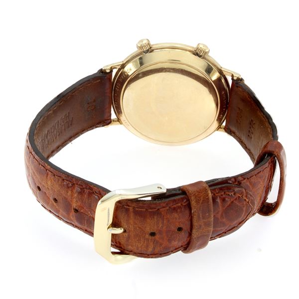 weight 38 g.10kt gold plated, ref. 1260, 34 mm round case. silver dial with indexes, date display at 3 o'clock, mechanical movement with manual winding, caliber 489, complete with strap with golden metal buckle, signed case, dial and movement