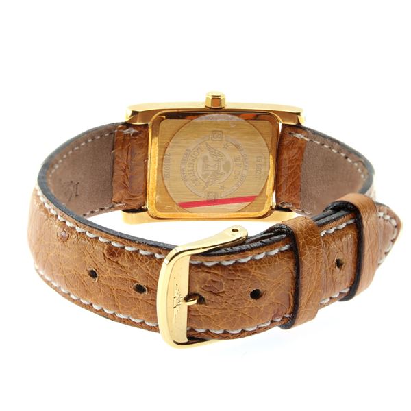 weight 29 g.in 18kt yellow gold, ref. L55027 - 28860755, rectangular case 33x22 mm. embellished with brilliant-cut diamonds, white dial with indexes and Arabic numerals, second counter at 6 o'clock, sapphire crystal, quartz movement, complete with strap with original gold-plated buckle, signed case, dial and movement