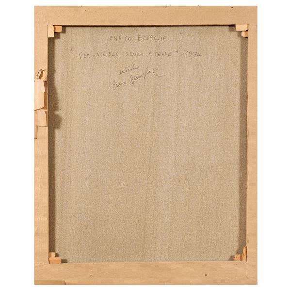 70x60 cm."Per un cielo senza stelle", 1974, oil on canvas, signed and dated lower right, signed, titled and dated on the reverse, within frame