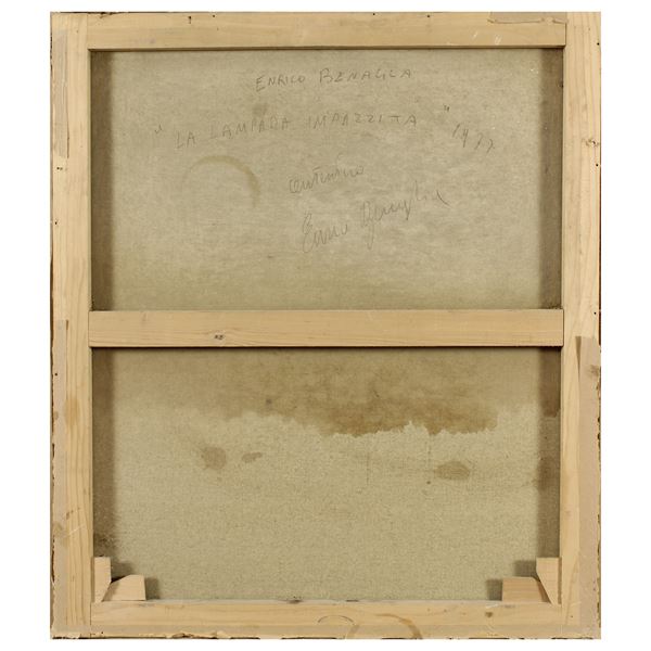 78x68 cm."La lampada impazzita", 1977, oil on canvas, signed and dated lower right, signed, titled and dated on the back, within frame