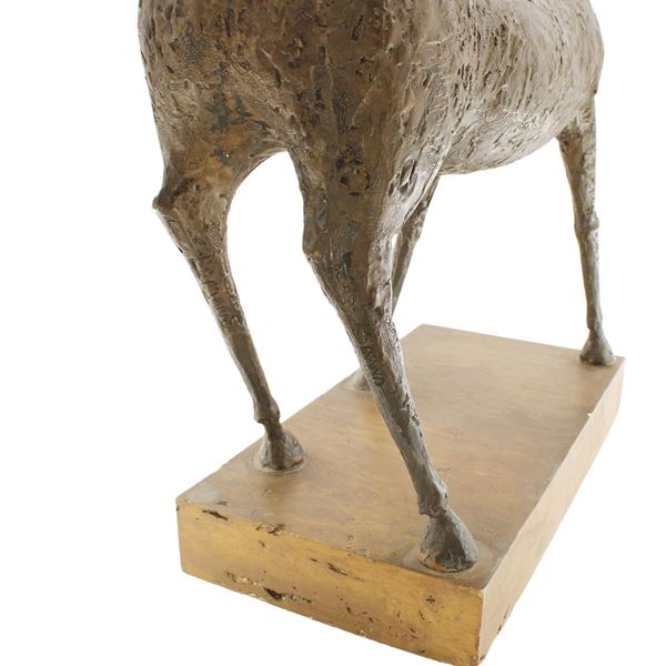 44x51x14 cm."Cavallo", bronze sculpture, resting on a rectangular travertine base