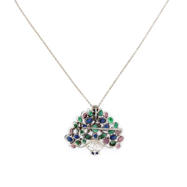 weight 16 g.in silver, sapphires, rubies and emeralds of different cuts, slight defects, alternating with brilliant cut diamonds, dimensions 3.5x4 cm.