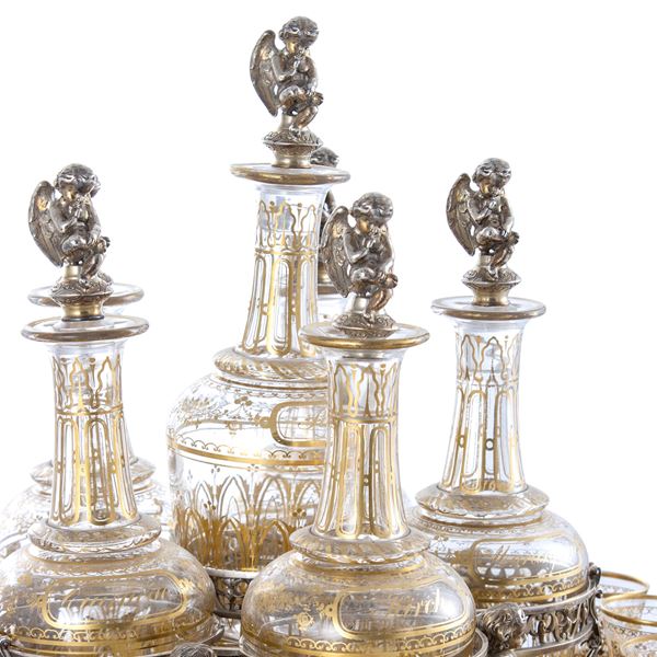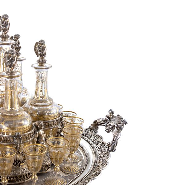 31x53x44 cm.marks of Odiot in Paris, perforated and chiselled circular body with vegetal motifs, cherubs and floral garlands, tray with handles in the shape of Mermaids, complete with six bottles and twelve glass glasses decorated in gold with floral and vegetal motifs, silver caps in the shape of winged cherubs, net weight 5.294 gr.