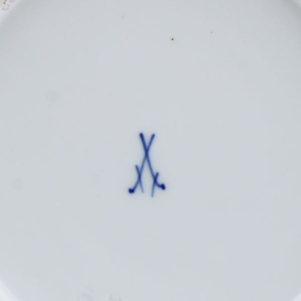 d. 20cm.in polychrome porcelain on a white and gold background, floral decoration with insects, production mark, one plate has slight defects