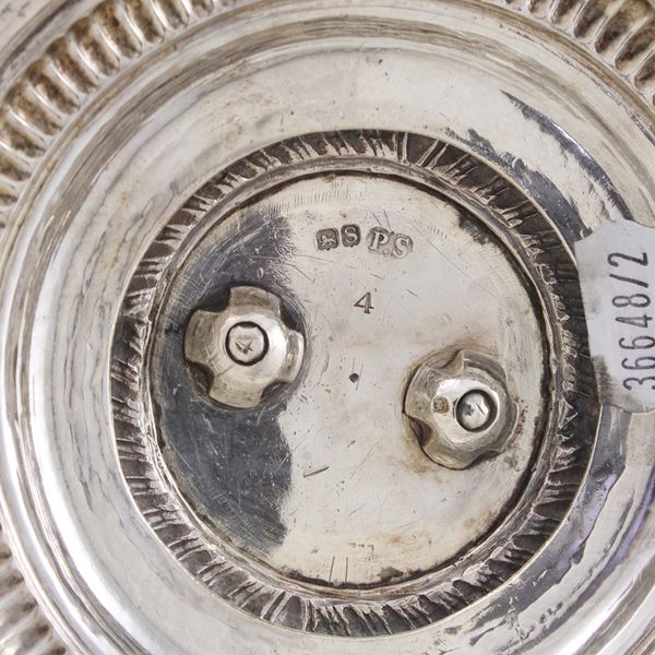 19x22x16.5 cm.marks of Paul Storr, plain circular bodies with pods, centered by heraldic coats of arms, grips chiseled with lion heads and vegetal volutes, resting on four curly feet, total weight 2383 g.