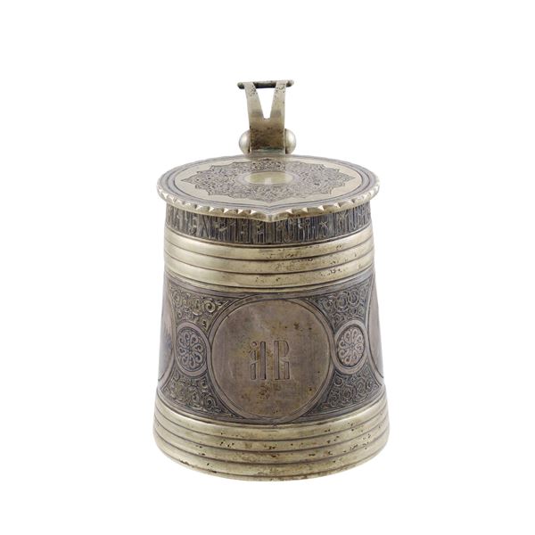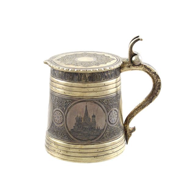 h. 13cm.assayer Viktor Savinkov, plain body engraved with views of Moscow and monogram within circular reserves, weight 518 gr.