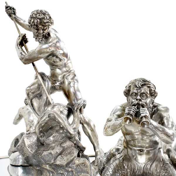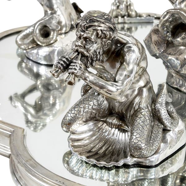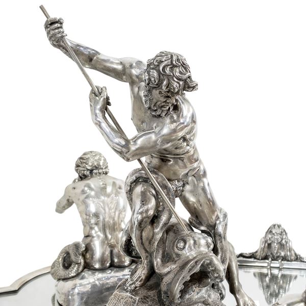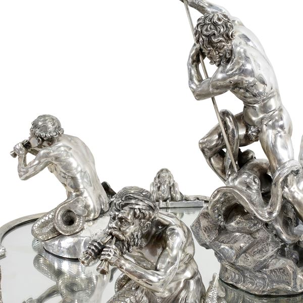 8x98x80 cm.comprising a mirrored tray with a mixtilinear edge resting on eight feet and nine mythological sculptures; in the center a sculpture depicting Neptune on a rock fighting with an octopus, h. 45cm. on the sides four sculptures depicting Tritons, h. 22cm. each and four groups depicting a mask between two dolphins, 8x15x4 cm. each. Net weight 16000 gr. circa Provenance: Rome, Petochi Collection Literature: Dawn of a New York. La New York World's Fair, 1939-1940