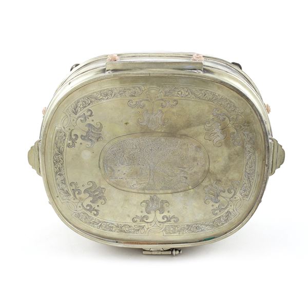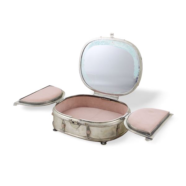 9x29x24 cm.marks of Gabriele De Vecchi, Milano, oval body with lid engraved with vegetal motifs, band decorated with rose quartz roses, interior with mirror and fabric padding, gross weight 2644 gr.
