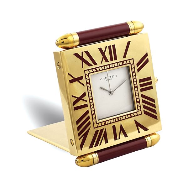 6.3x5 cm.in gilt metal and red lacquer with red enamel Roman numerals on the bezel, white dial without indexes, quartz movement, complete with original box