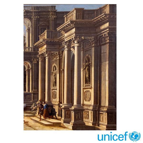 96x136 cm."Aeneas and Dido leave the palace of Carthage", oil on canvas, framed Provenance: Private collection Rome, formerly J.H. collection Weitzner, London Literature: Busiri Vici A, Fantasie architettoniche di Alessandro Salucci, Capitolium, 1962, pag.10, fig. 15-16 - Giancarlo Sestieri, Il Capriccio architettonico in Italia nel XVII-XVIII secolo, Vol.III, pag. 228, fig. 13a-13bb