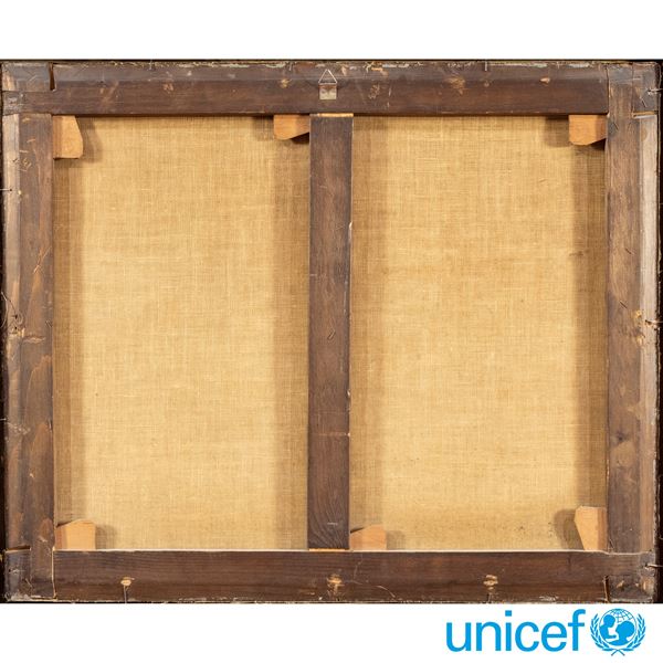 61x74 cm."Snowy landscape with characters", oil on canvas, framed Provenance: private collection, Rome