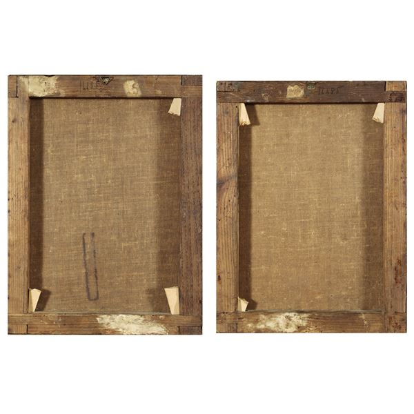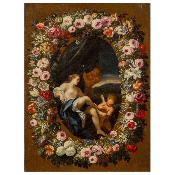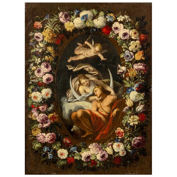 39.5x29.5 cm."Selene ed Endimione entro ghirlanda floreale - Amore toglie una spina dal piede di Venere entro ghirlanda floreale", pair of oils on canvas, within frames