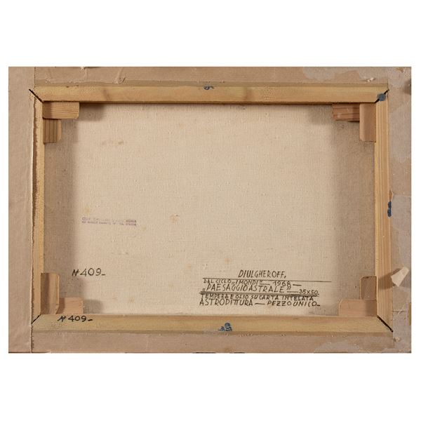 35x50 cm."Paesaggio Astrale", 1968, tempera and oil on canvas paper, signed lower left, signed, dated and titled on the back, within frame