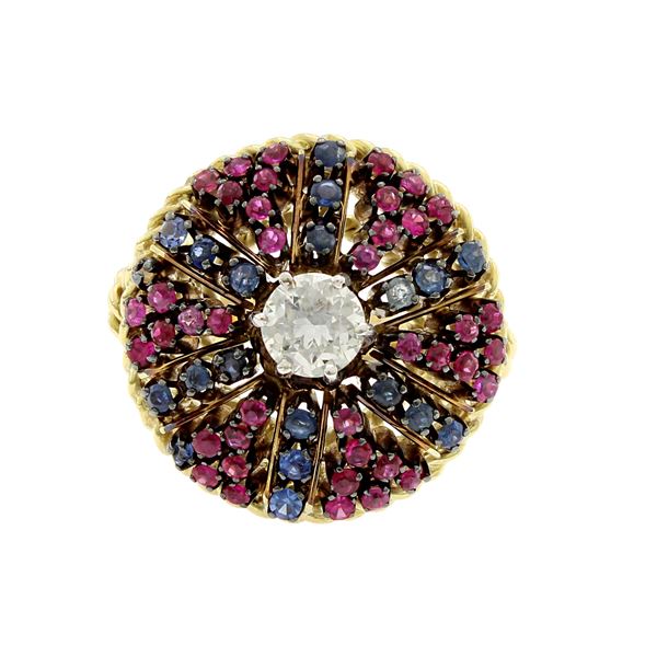 weight 11 g.centered by a brilliant cut diamond circa 0.50 ct, round rubies and sapphires, size 13
