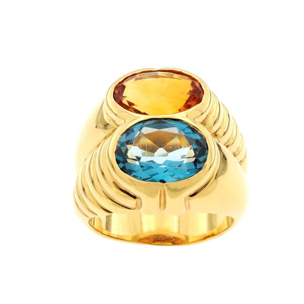 weight 21 gr.18kt yellow gold mixed oval cut blue and yellow topaz, size 13, complete with box