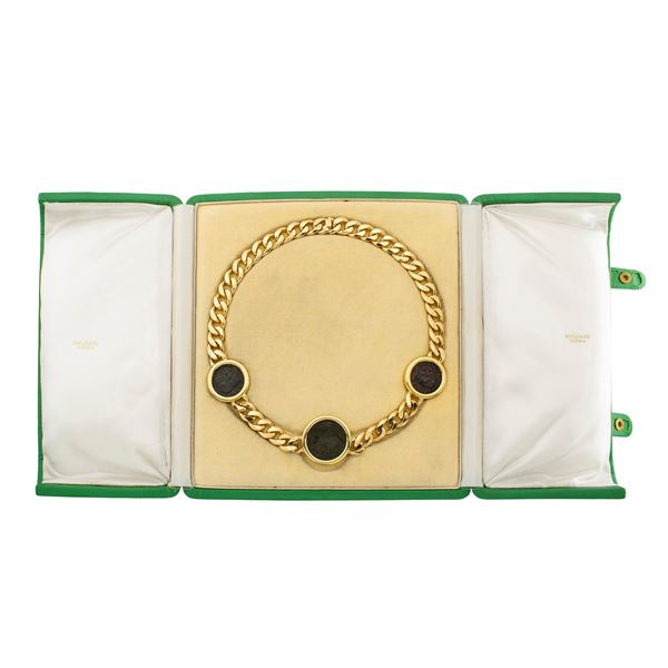 weight 272 gr.in 18kt yellow gold groumette link with three Roman coins depicting Diocleziano, Faustina and Vetranio, complete with box. Reference literature for similar models: catalogo della mostra Tra Eternità e Storia Bvlgari dal 1884 al 2009, 125 anni di Gioielli italiani, Roma, Palazzo delle Esposizioni 22 maggio - 13 settembre 2009, a cura di Amanda Triossi, Skira, Roma, 2009, pag. 339, n.329