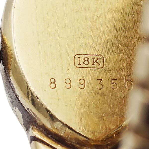 weight 98 grin 18kt yellow gold, 19x14 mm case. ref. 899350 golden dial with indexes, mechanical movement with manual winding Juvenia 845, three-spiral tubogas bracelet in yellow gold, signed case, dial and movement, complete with box