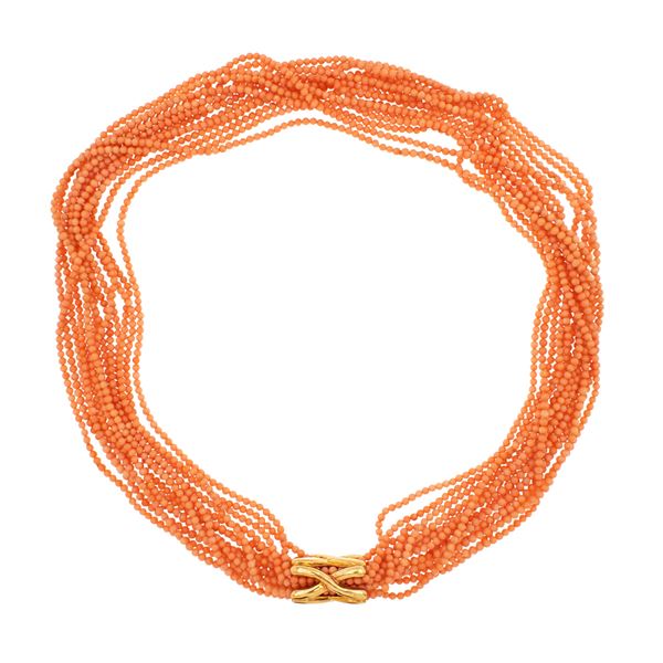 fourteen coral strands joined by a central 18kt yellow gold, length 79 cm.