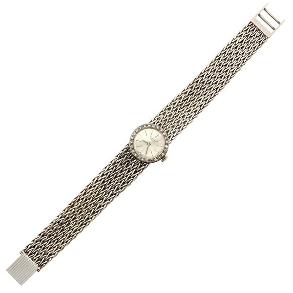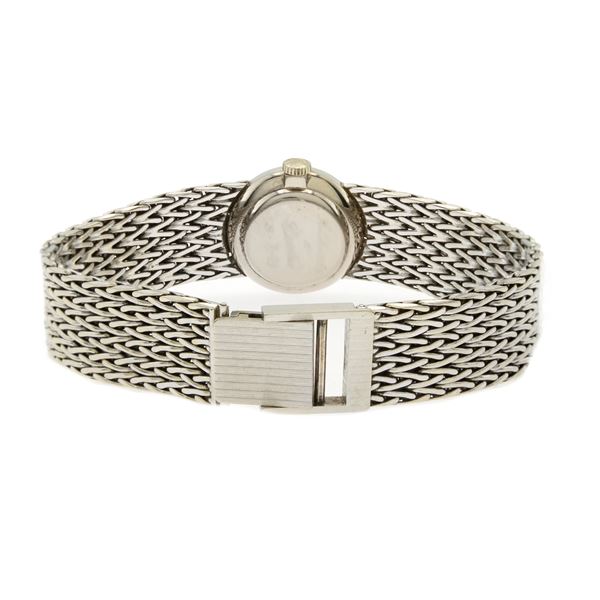weight 46 gr.in 18kt white gold, ref. 40736, 19 mm round case. bezel with huit-huit cut diamonds, silvered dial with indexes, mechanical movement with manual winding, caliber 320, original white gold braided mesh bracelet, length 18 cm. signed case, dial and movement