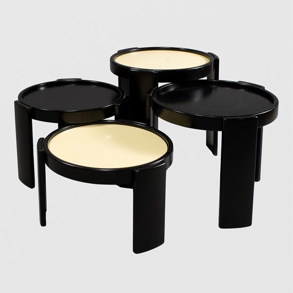 Maximum size 38x40 cm.four 780 mod. stackable tables, in black lacquered wood, two -tone laminate shelves, production label, wears