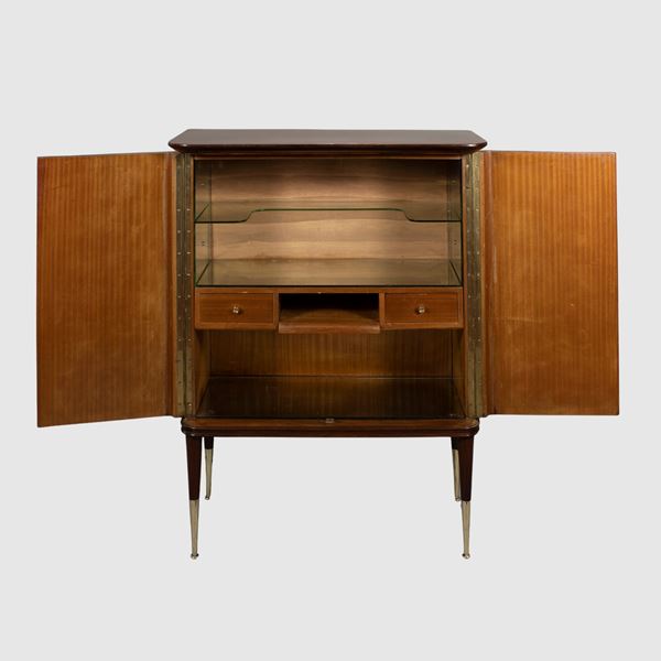 112x88x42 cm.wooden bar cabinet, brass, mirrored glass and transparent glass, slight wears