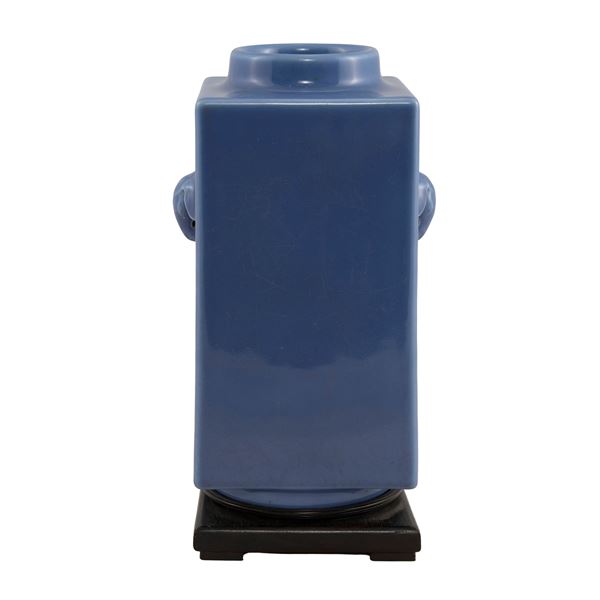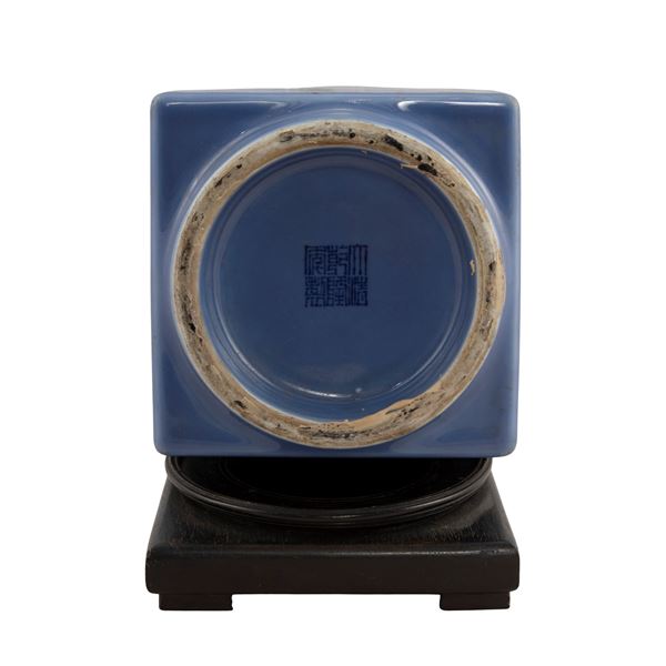 29.5x13x13 cm.porcelain with blue background with elephant head grips, Qianog brand under the base, resting on wooden base