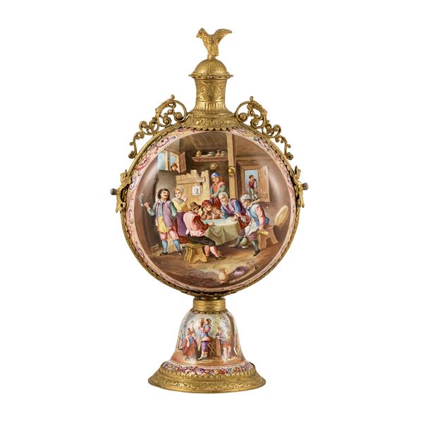 31x17,5 cm. body deorated with gender scenes inspired by the 17th century Flemish painting, resting on a circular base, golden bronze finishes and chiseled, cap with eagle shaped grip, slight wears