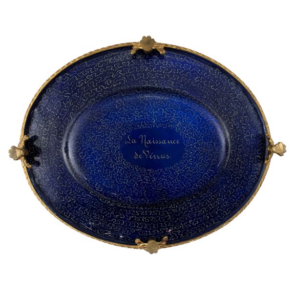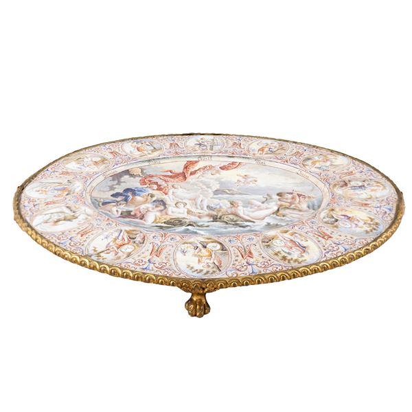 4x31x26 cm.oval shaped polychrome in the pastel shades depicting the birth of Venus in the center, an external band with medallions depicting allegories of the months of the year, mounted on a golden bronze base with four ferrine feet.