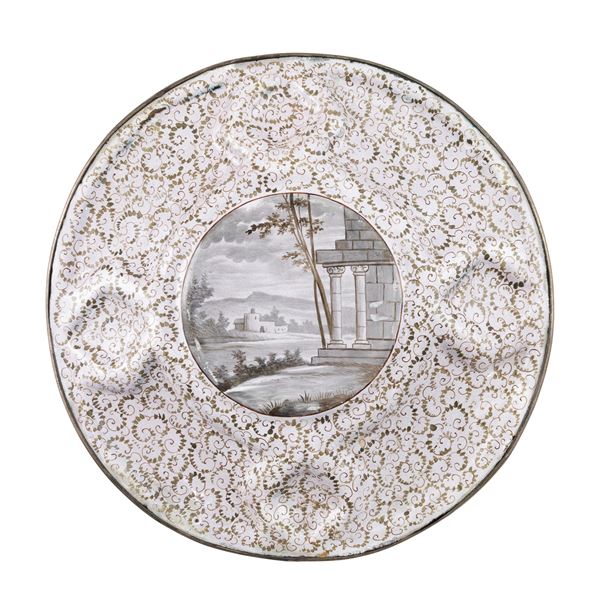 d. 21 cm.circular shape, depicting the rat of Europe, a band surrounded by panels in reserve with cherubs and allegorical scenes