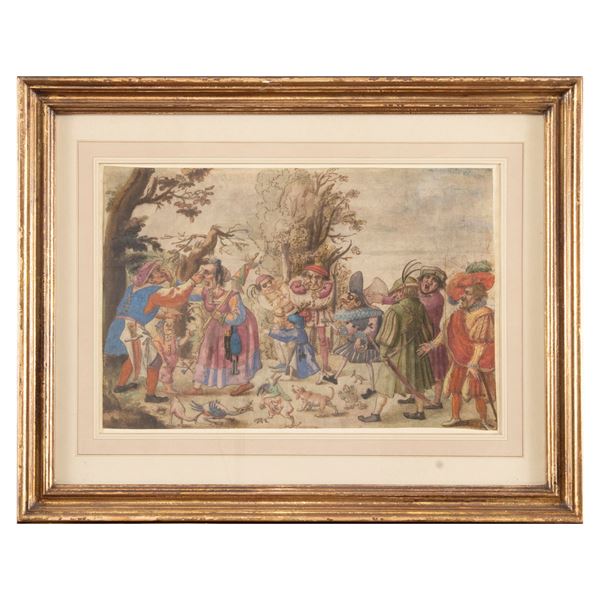 28,8x43.4 cm."Caricature degli attori dalla commedia dell'arte", pen and brown ink, watercolor and gouache on paper, within frame.