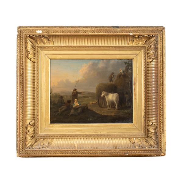 22x28.5 cm."Peasant life scene with white horse", oil on panel, within frame