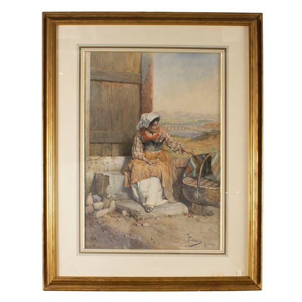 54x38 cm."Popolana with basket with bridge in the background", watercolor on paper, signed lower right, within frame